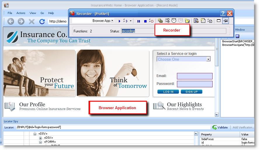Browser Application Recorder を使用して、テスト中に仮想ユーザーが行う操作 (リンクのクリック、フィールドへのデータ入力、データ送信、ポップアップ ウィンドウを開くなど) と同じ方法でサンプル アプリケーションとやり取りします。アクションは、Browser Application Recorder によってキャプチャされ、記録されます。